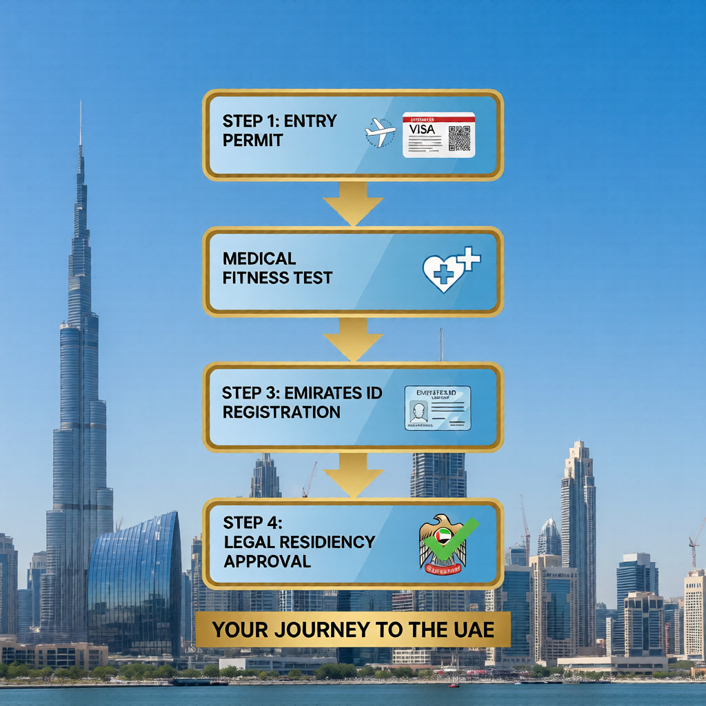 For example, a software engineer moving to Dubai on a job offer first enters the UAE on an entry permit, completes medical screening, applies for an Emirates ID, and then receives legal residency status as an employee.