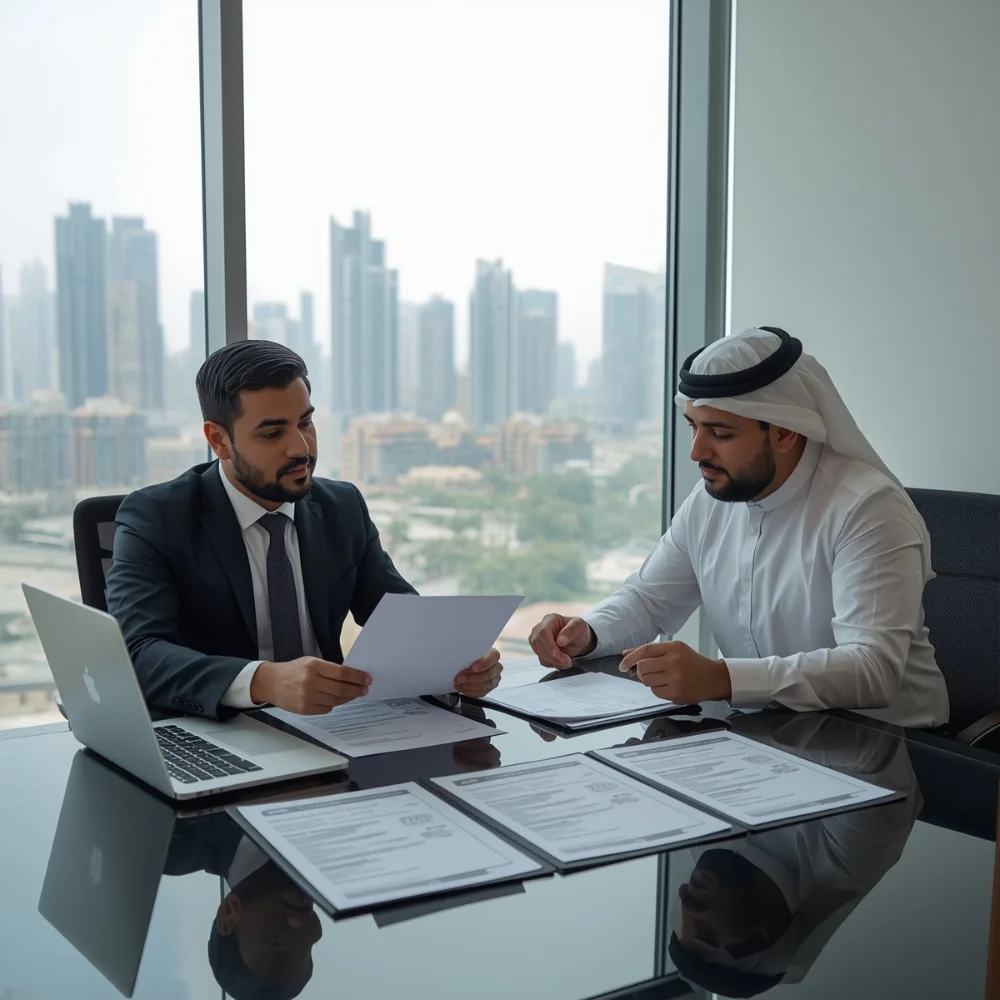 Image of two businessmen reviewing documents in a Dubai office regarding types of business licenses available in the UAE.